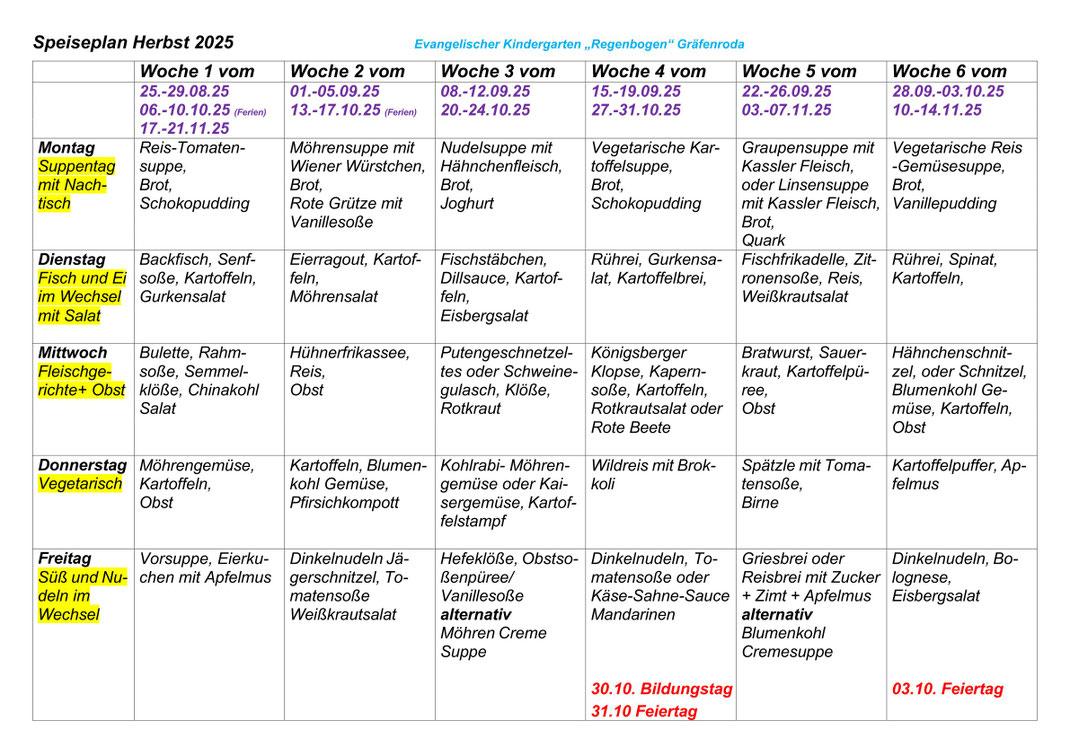 Um sicherzustellen, dass die Kinder eine abwechslungsreiche und ausgewogene Ernährung erhalten und verschiedene Geschmacksrichtungen kennenlernen, ist jeder Wochentag wie folgt festgelegt: